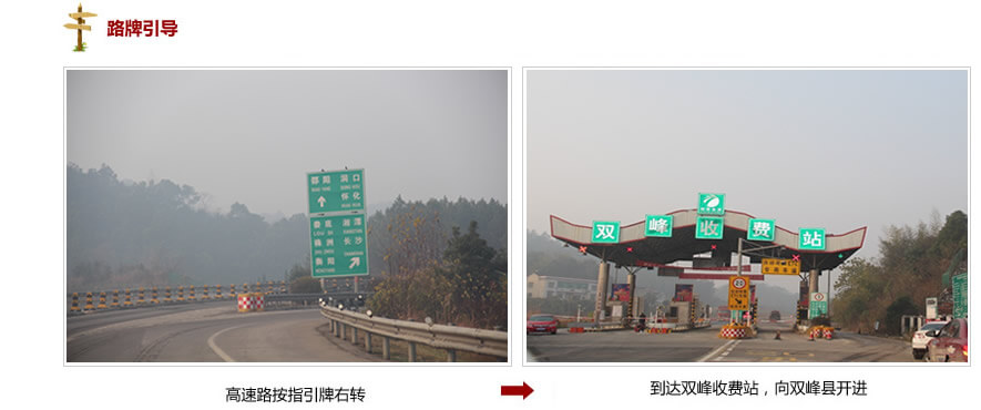 1.京珠高速(G4)經湘潭轉滬昆高速(G60)到雙峰出口下,收費站前500M三岔路口右轉,向雙峰縣城開約15KM;